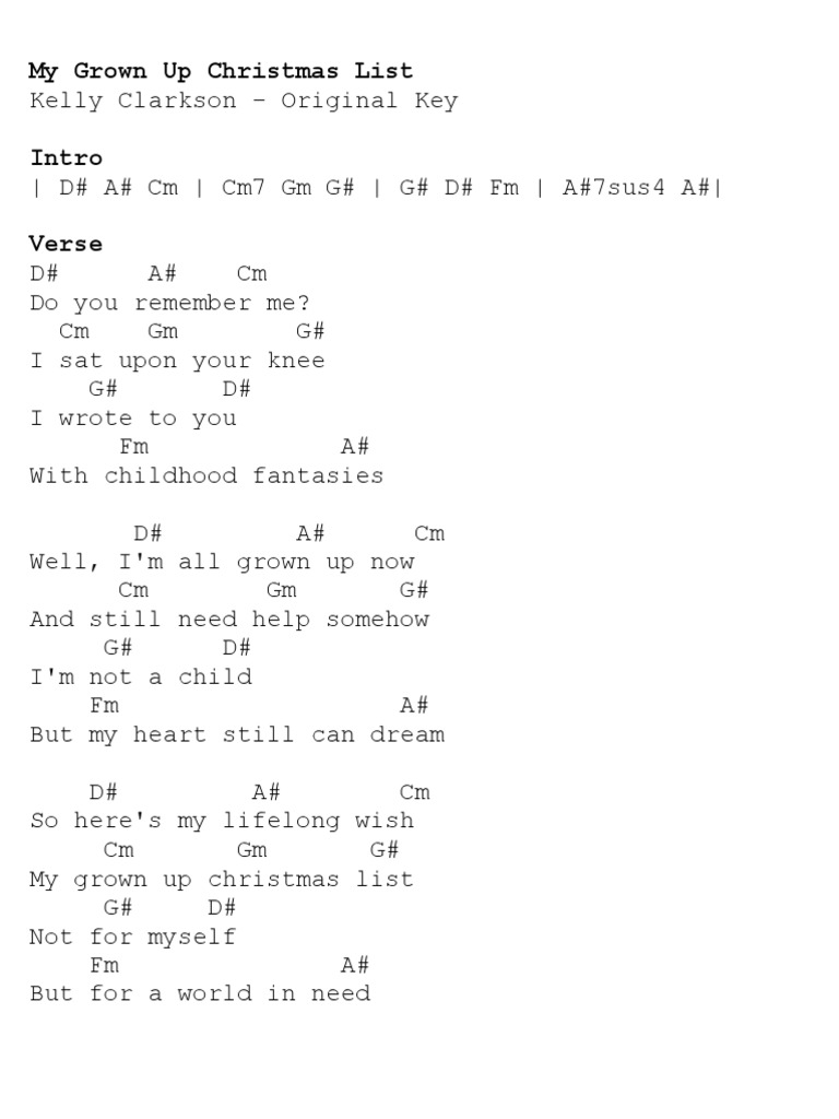 My grown up christmas list by kelly clarkson chords yalp my grown up christmas list chords by kelly clarkson song s chords d cm g fm a gm c am f g em b e d c m a f m c a m f. It is in d flat originally not it is in d flat originally not artist. Eb gm cm ab fm bb c am f dm em g b d dbm a gbm db bbm gb chords for kelly clarkson my grown up christmas list with capo transposer play along with guitar piano ukulele mandolin.