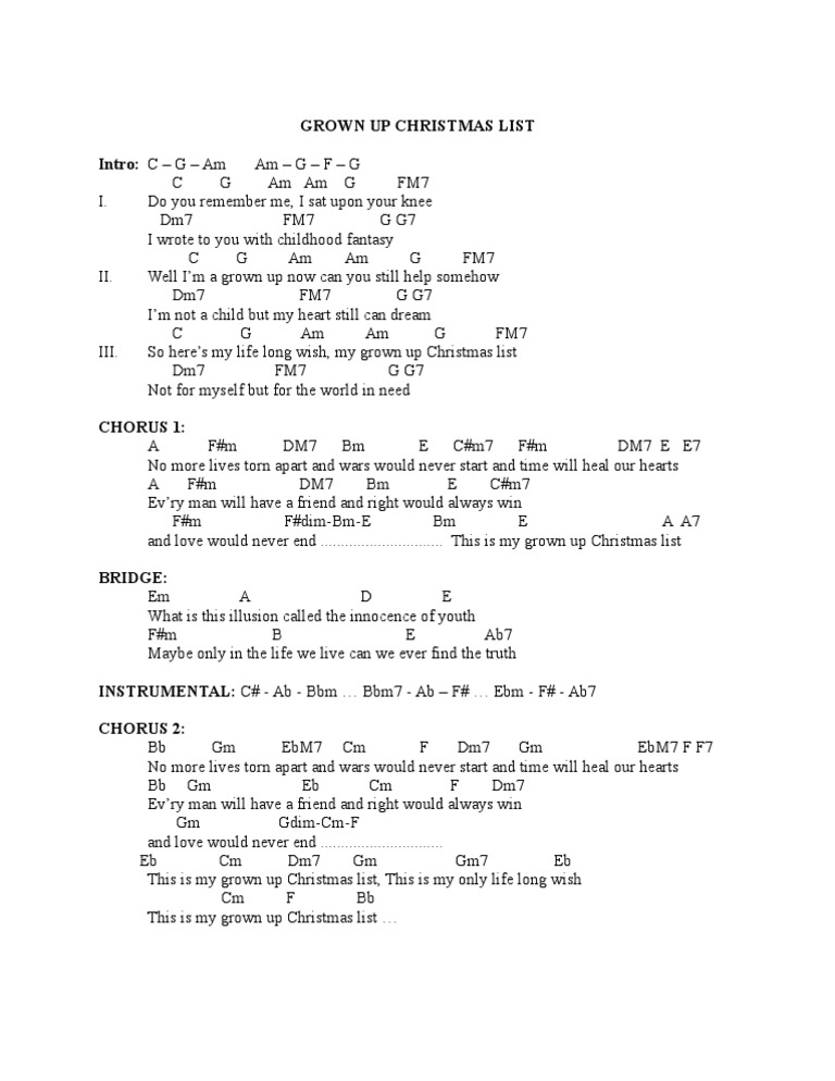 My grown up christmas list chords. Play with a capo on 4 to match album key g d f em d c do you remember me i sat upon your knee c g b am am7 d i wrote to you with childhood fantasies g d f em d c well i m all grown up now and still need help somehow c g b am am7 d i m not a child but my heart still can dream g. X33211 or 133211 dm. Grown up christmas list amy grant album.