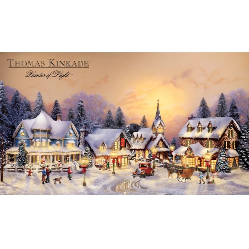 More buying choices 80 00 4 used new offers thomas kinkade crystal snowman figurine featuring light up village and animated train by the bradford editions. A collectable first and a unique christmas decoration inspired by the original works of renowned artist thomas kinkade approved by the painter of light himself and available only from the bradford exchange. In village christmas i have tried to capture a christmas of a simpler time where street lamps glow with the warm light of a natural flame and the townsfolk use a leisurely stroll to church as the opportunity to stop and chat about the joyous season.